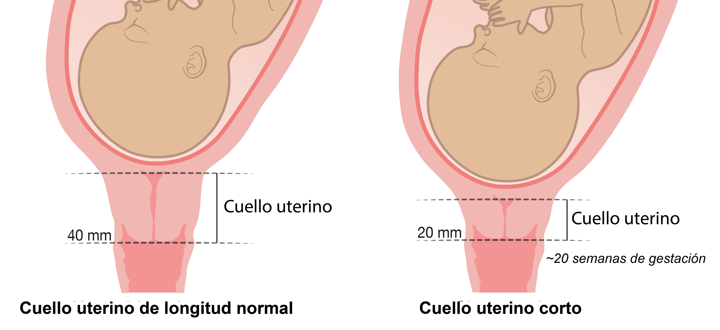 El cuello uterino es un conducto que conecta la parte inferior del útero con la parte superior de la vagina. La distancia entre estos dos puntos es la longitud cervical. Esta medida difiere de la dilatación cervical, que es cuánto se abre el cuello uterino durante el parto. Se diagnostica cuello uterino corto cuando la longitud del cuello uterino es igual o inferior a 25 mm, lo que equivale aproximadamente a 1 in.