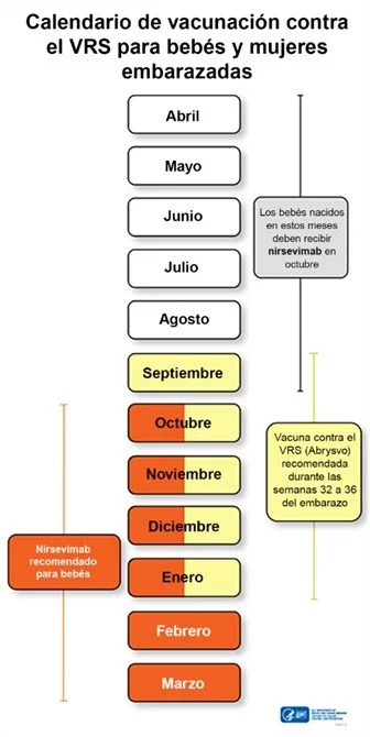 Las mujeres embarazadas pueden recibir la vacuna contra el VRS (Abrysvo) durante las semanas 32 a 36 de embarazo en la temporada del VRS (que comprende del 1 de septiembre al 31 de enero en la mayoría de las zonas de los Estados Unidos).